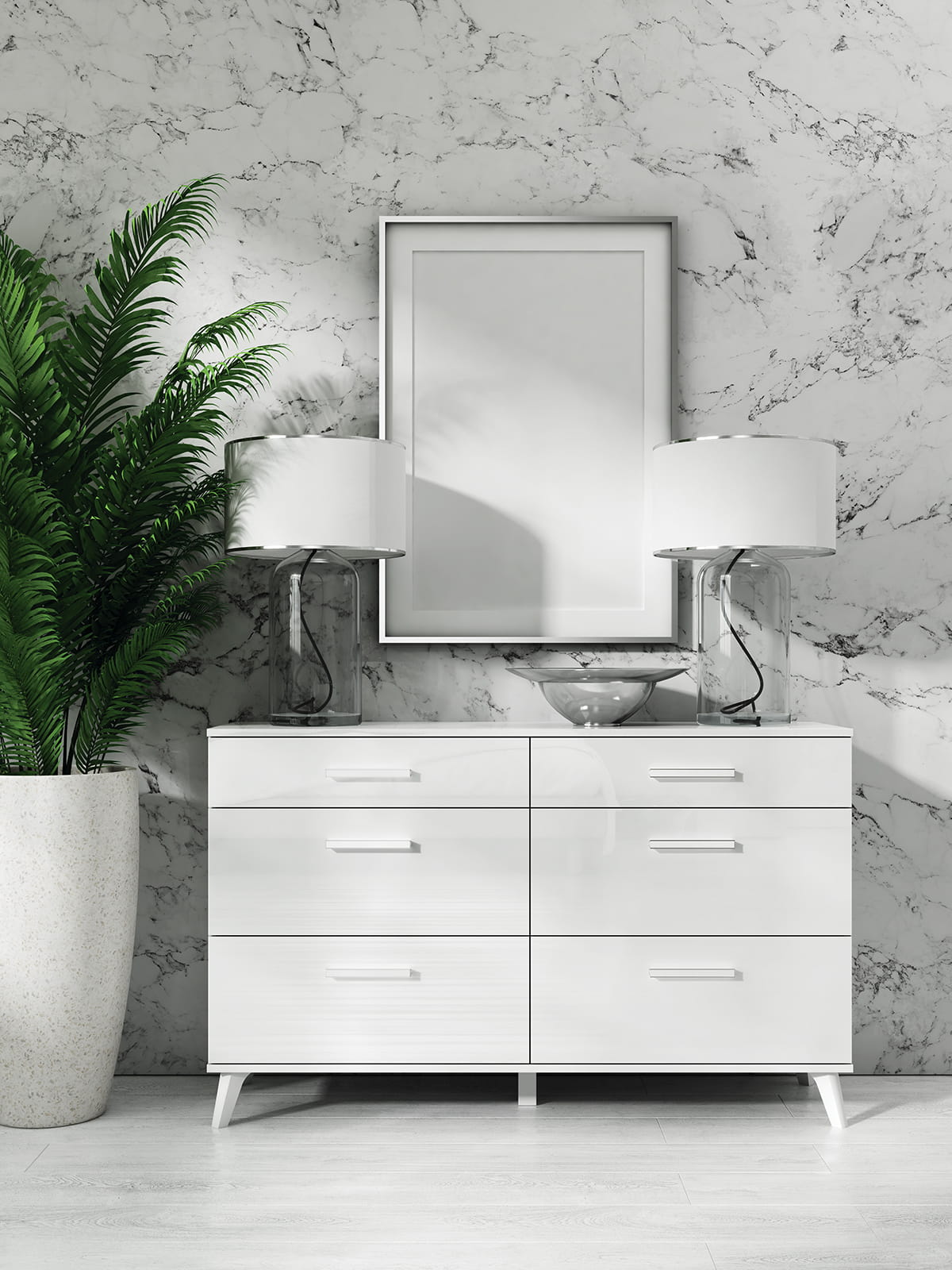 Połyskująca biel dodaje prostym bryłom oryginalnego charakteru, a metalizujące uchwyty podkreślają ich współczesny styl. Subtelna gra odbić na frontach i wieńcach górnych wygląda efektownie oraz powiększa optycznie pokój. Modne i praktyczne nóżki sprawiają, że meble prezentują się lekko, a wnętrze sprawia wrażenie bardziej przestrzennego.