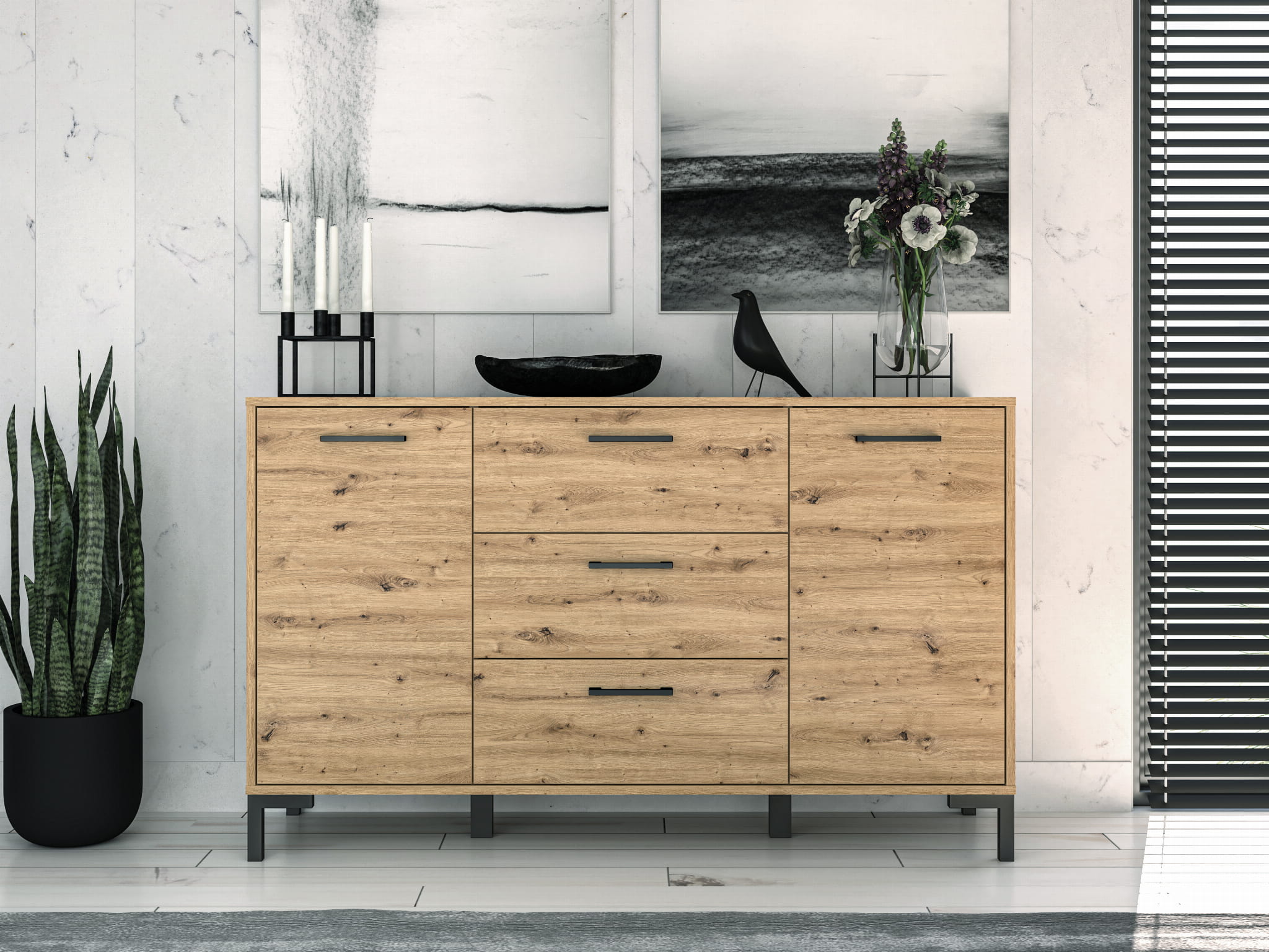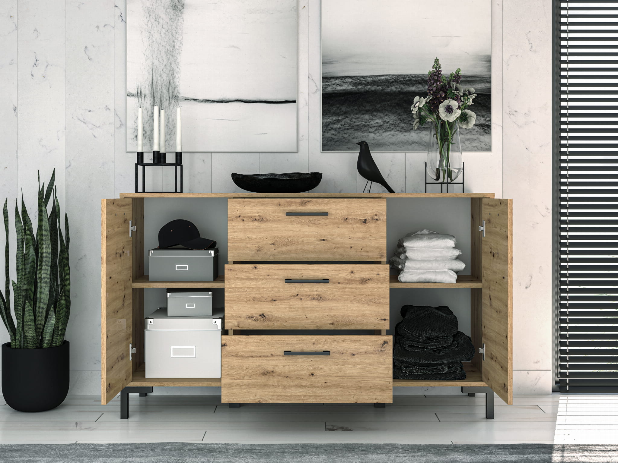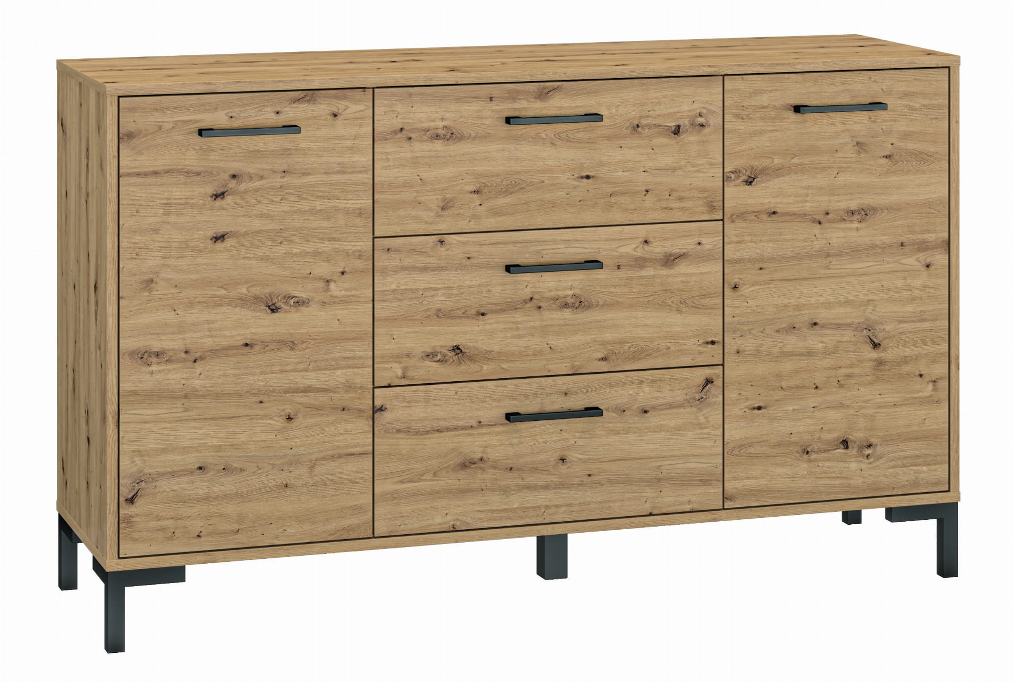 Zestawienie wyraźnie usłojonego dekoru dąb artisan z czarnymi uchwytami i nóżkami to idealne rozwiązanie do współczesnego wnętrza. Przemyślana konstrukcja brył zapewni miejsce do przechowywania ubrań. Dzięki różnorodności mebli Nevio z łatwością zaaranżujesz małe jak i duże wnętrze.