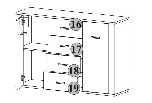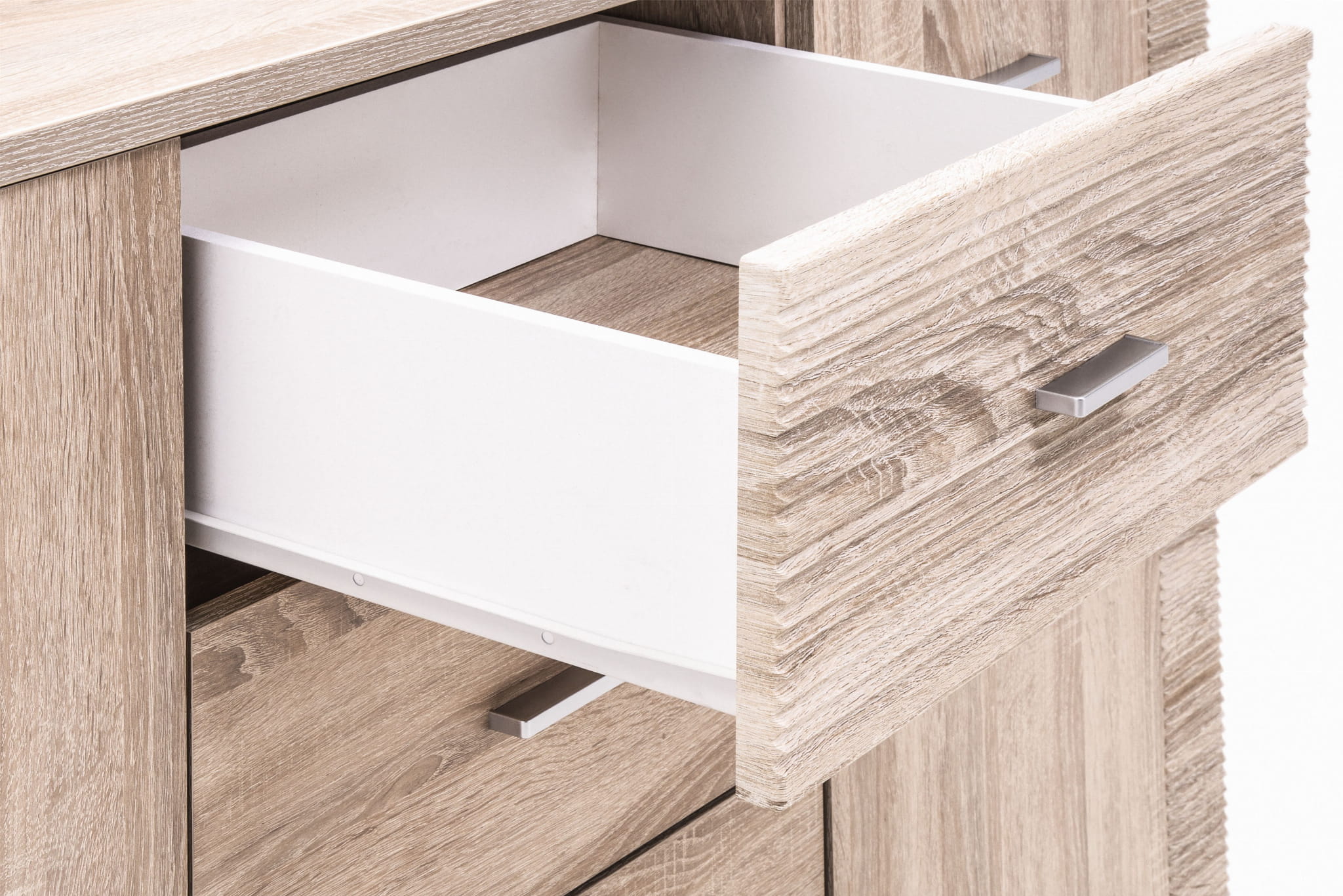 Komoda GRESS wyposażona jest w szafki zamykane na fronty i szufladki. Prosta forma przypadnie do gustu miłośnikom minimalizmu. Idealnie sprawdzi się w aranżacji pomieszczeń takich jak: pokój dzienny, salon, przedpokój, sypialnia, gabinet lub pokój młodzieżowy. Elegancja jasnego dekoru oraz wyrazistość ryflowanych zdobień to charakterystyczny wyróżnik tej kolekcji mebli. Kolor tych mebli naturalnie łączy się z szeroką gamą barw farb oraz tapet jakie możemy zastosować na ścianach pomieszczeń.