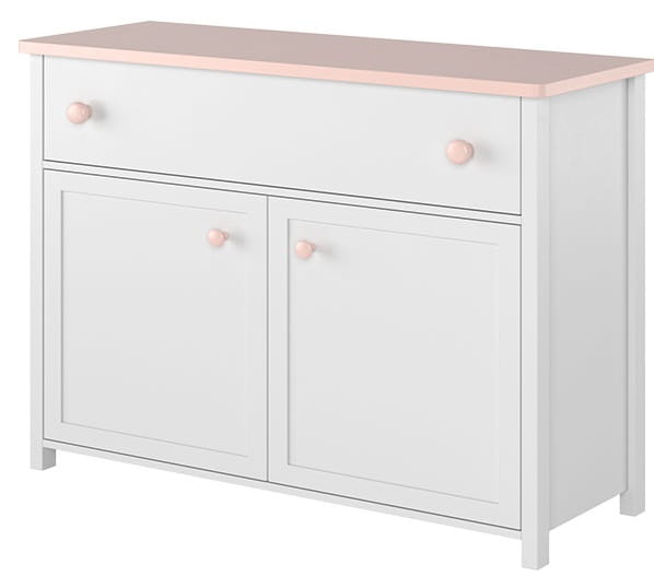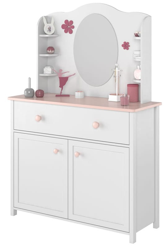 Mebel wyróżnia się oryginalnym charakterem. Bryła w kolorze alpejskiej bieli oraz blat i dodatki w kolorze pudrowego różu tworzą niepowtarzalny styl, który spodoba się wielbicielkom bajek o księżniczkach.