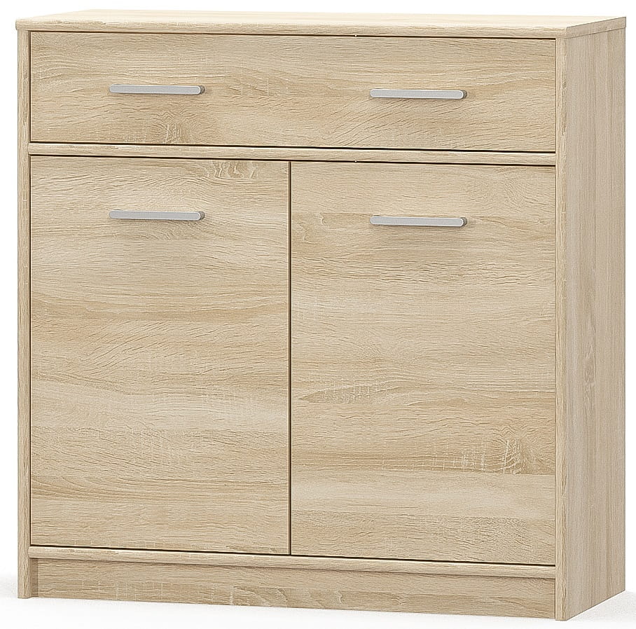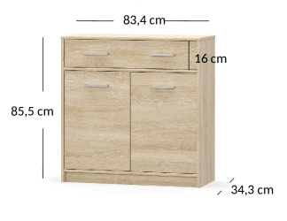 Komoda 2d1s to sprawdzony mebel do pomieszczeń takich jak: salon, przedpokój, sypialnia, garderoba, pokój młodzieżowy i dziecięcy, bądź gabinet i biuro. Moduł posiada długą szufladę, która zapewni lepszą organizację drobnych przedmiotów, a podwójne drzwiczki ułatwią ułożenie w nich na przykład zastawy, pościeli lub ubrań. Komoda jest dostępna w 2 zestawieniach kolorystycznych: dąb sonoma oraz dąb sonoma z białymi frontami, taki wybór ułatwi zaaranżowanie każdego wnętrza.