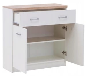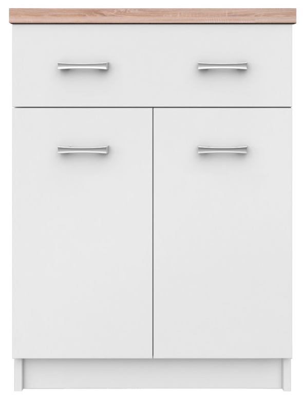 Komoda 2d1s/60 to sprawdzony mebel do pomieszczeń takich jak: salon, przedpokój, sypialnia, garderoba, pokój młodzieżowy i dziecięcy, bądź gabinet i biuro. Moduł posiada długą szufladę, która zapewni lepszą organizację drobnych przedmiotów, a podwójne drzwiczki ułatwią ułożenie w nich na przykład zastawy, pościeli lub ubrań. Komoda jest dostępna w 2 zestawieniach kolorystycznych: dąb sonoma oraz biały w połączeniu z blatem imitującym drewno, taki wybór ułatwi zaaranżowanie każdego wnętrza.