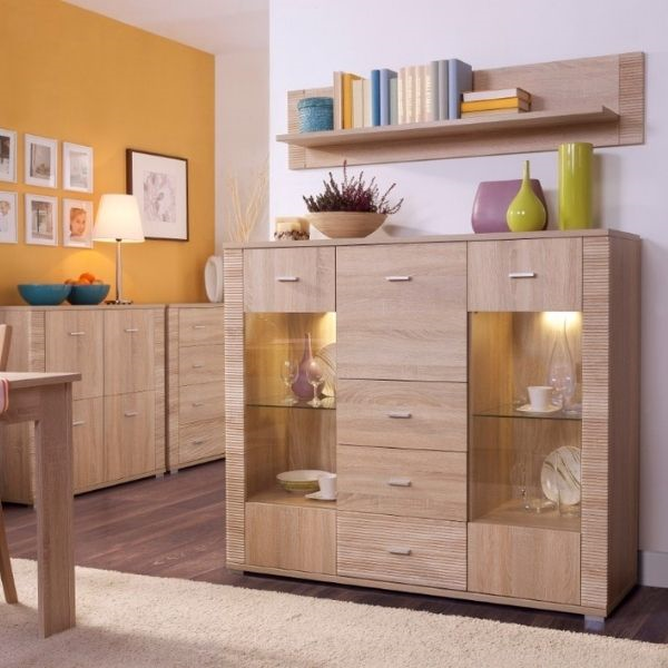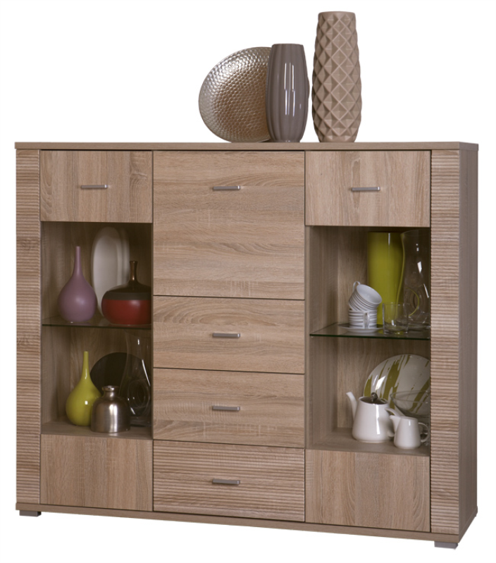 Rozbudowana komoda GRESS 2w3s1b to idealny mebel do salonu, pokoju dziennego lub jadalni. Tym co ją wyróżnia jest barek. Oprócz niego jak przystało na każdą komodę jej wnętrze wypełniają szuflady i półki. Przeszklone fronty pozwolą wyeksponować dodatki lub dekoracje. Dzięki temu uzyskano mebel funkcjonalny, a jednocześnie oryginalny i dobrze się prezentujący. Jak wszystkie meble z kolekcji GRESS również tą komodę zdobią ryflowane listwy nadające specyficzny i niepowtarzalny charakter. Mebel dostępny jest w dwóch odcieniach – dąb sonoma oraz wenge.