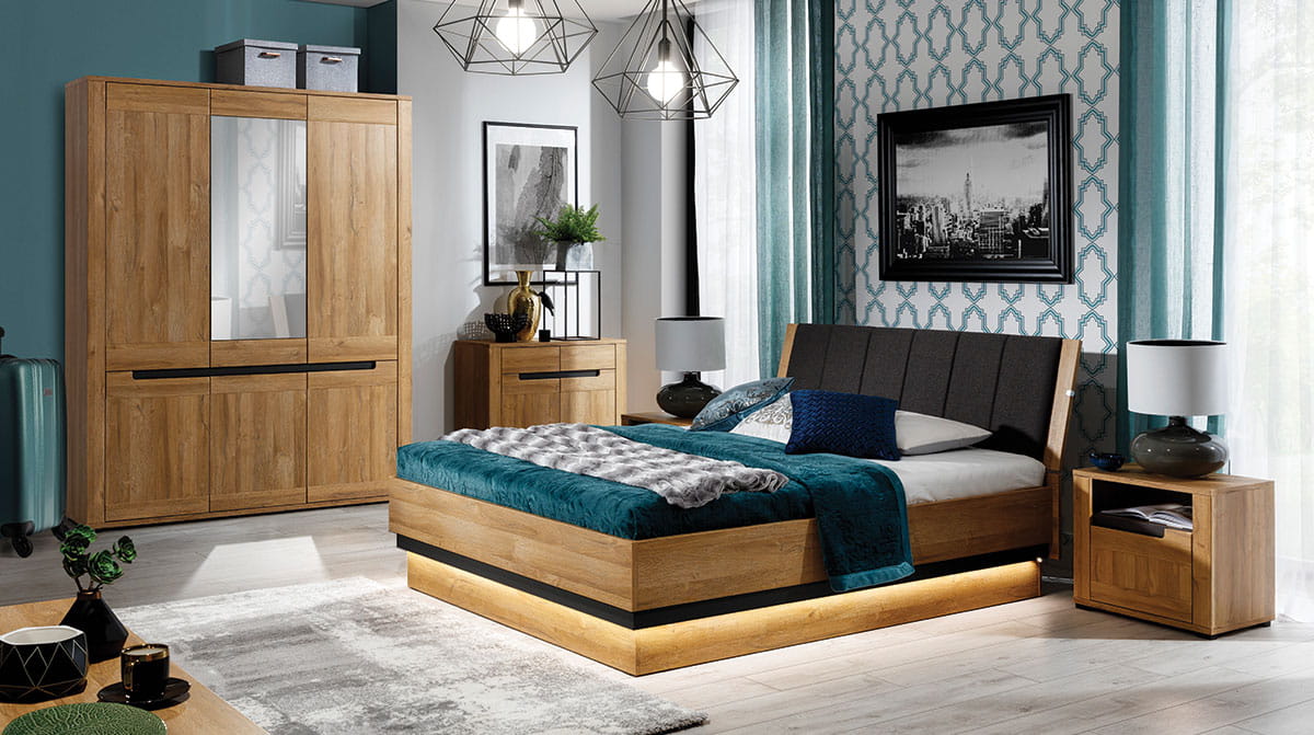 Korpus łóżka sporządzony jest z płyty meblowej pokrytej estetycznym laminatem, który nadaje powierzchni mebla schludnego wyglądu. Posiada wysoki tapicerowany zagłówek, który zadba o Twoją wygodę podczas czytania dobrej książki lub oglądania telewizji przed snem. Ten wyjątkowy model swój atrakcyjny wygląd zawdzięcza stylowej formie oraz czarującej kolorystyce w postaci połączenia dębu grandson z grafitowymi dodatkami, które pozwoliło otrzymać niezwykle designerski mebel do każdego rodzaju wnętrz. Ponadto istnieje możliwość wyposażenia prezentowanego łóżka w oświetlenie LED, które pięknie podkreśli jego nowoczesny styl i stworzy przyjemny nastrój w Twojej sypialni, szczególnie wieczornymi porami