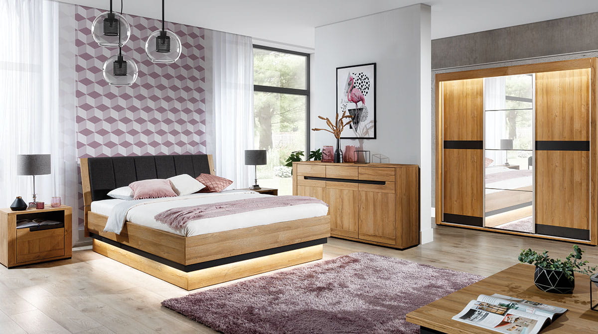 Korpus łóżka sporządzony jest z płyty meblowej pokrytej estetycznym laminatem, który nadaje powierzchni mebla schludnego wyglądu. Posiada wysoki tapicerowany zagłówek, który zadba o Twoją wygodę podczas czytania dobrej książki lub oglądania telewizji przed snem. Ten wyjątkowy model swój atrakcyjny wygląd zawdzięcza stylowej formie oraz czarującej kolorystyce w postaci połączenia dębu grandson z grafitowymi dodatkami, które pozwoliło otrzymać niezwykle designerski mebel do każdego rodzaju wnętrz. Ponadto istnieje możliwość wyposażenia prezentowanego łóżka w oświetlenie LED, które pięknie podkreśli jego nowoczesny styl i stworzy przyjemny nastrój w Twojej sypialni, szczególnie wieczornymi porami