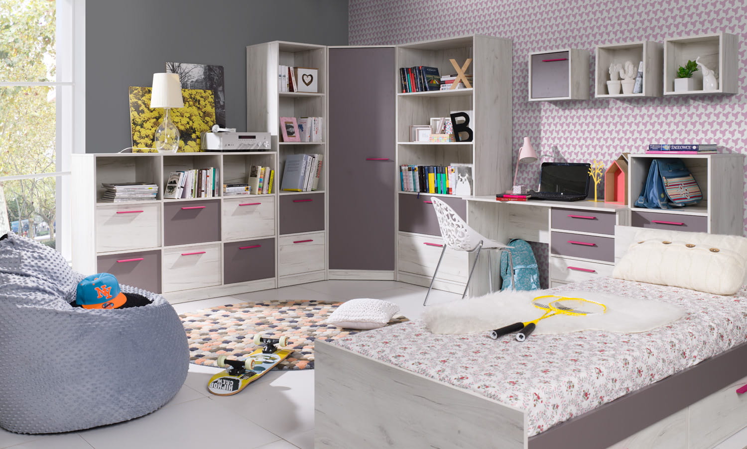 System młodzieżowy Rest to m.in. praktyczne regały (zarówno otwarte- na których można postawić przedmioty, które chcemy wyeksponować np. pamiątki, książki, zdjęcia, oraz zamknięte). Poza tym w skład sytemu wchodzą również komoda (z głebokimi szufladami na pełny wysów ), wygodne łóżko z 4 szufladami oraz pojemne szafy.