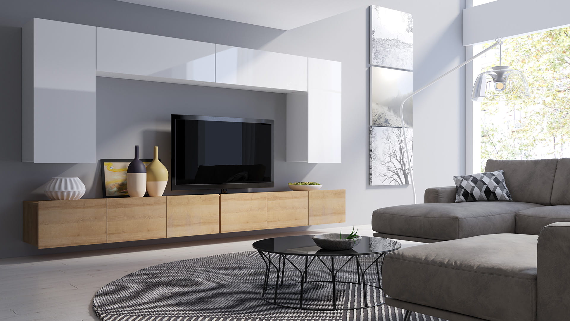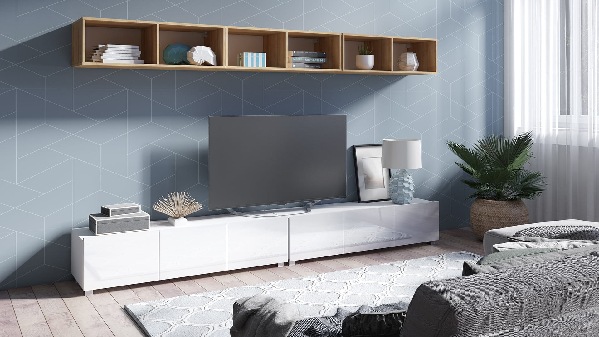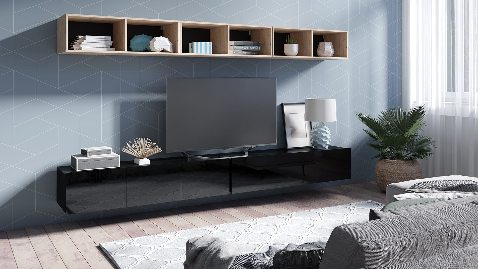 Szafki RTV, stoliki nocne oraz półka KWADRAT wykonane są uniwersalnie tzn. można je zawiesić lub postawić na podłodze po dokręceniu nóżek, które znajdują się w zestawie.