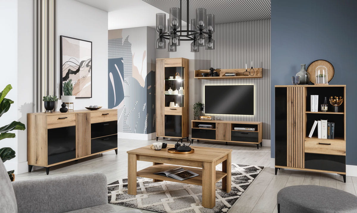 ARIS to nowoczesna i elegancka kolekcja mebli. Zestawienie wyraźnie usłojonego dekoru dąb EVOKE z czarnymi uchwytami i nóżkami to idealne rozwiązanie do współczesnego wnętrza. Przemyślana konstrukcja brył zapewni miejsce do przechowywania. Dzięki różnorodności mebli ARIS z łatwością zaaranżujesz małe jak i duże wnętrze.