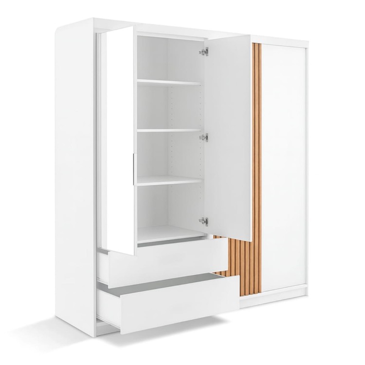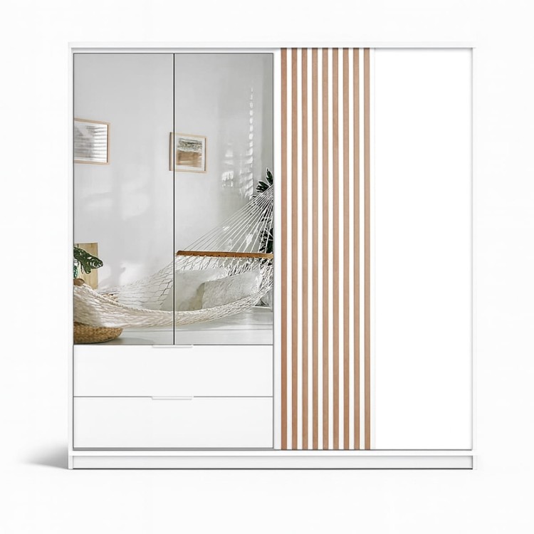 Szafa MAJORKA 203 to wyjątkowe połączenie nowoczesnej elegancji i funkcjonalnego designu. Biały korpus w połączeniu z dekoracyjnymi lamelami w naturalnym odcieniu drewna nadaje meblowi lekkości i stylowego charakteru. Duże lustro na froncie rozświetla wnętrze, optycznie je powiększając i dodając mu przestronności – idealne rozwiązanie do sypialni, garderoby czy przedpokoju.