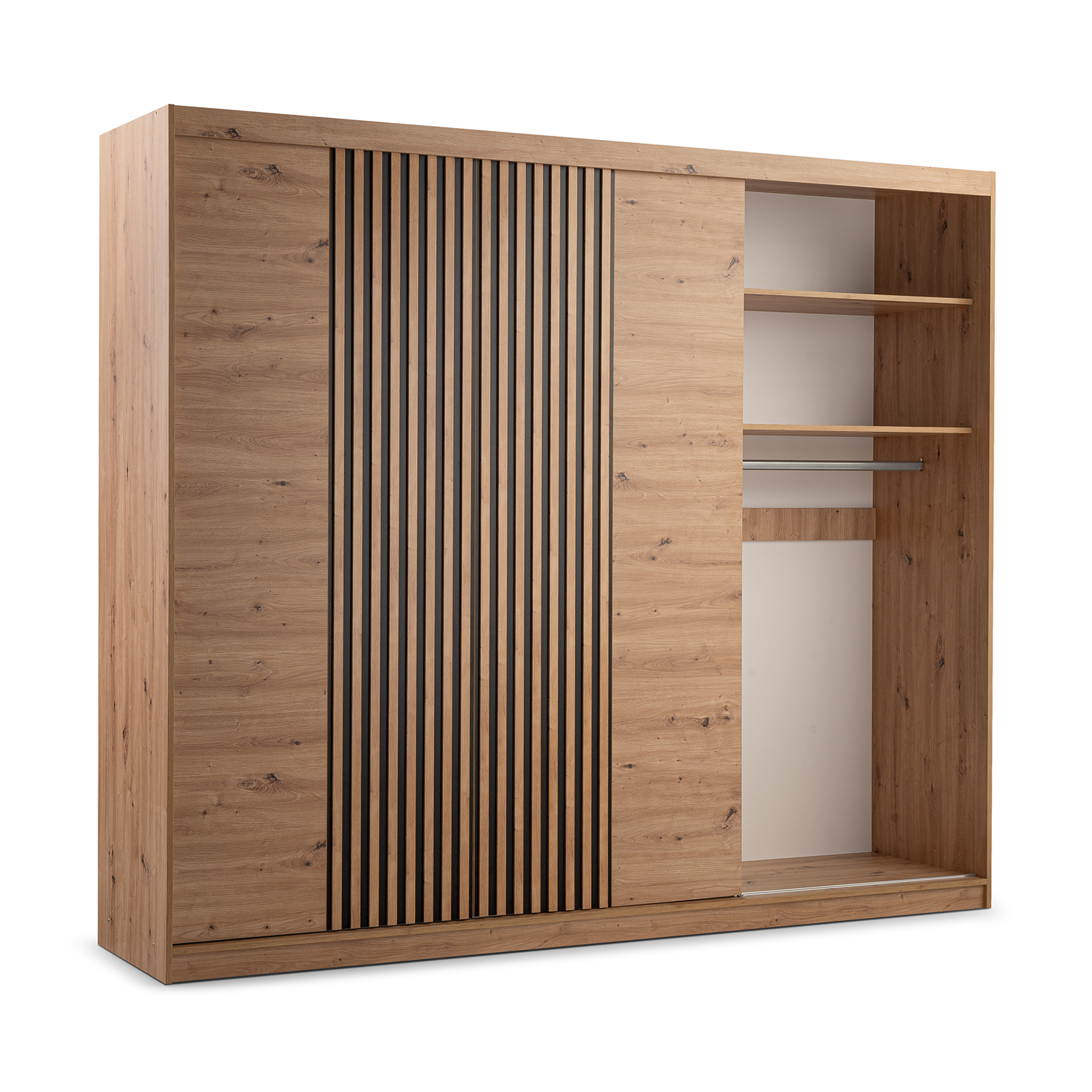 Szafa Majorka to doskonałe połączenie funkcjonalności i nowoczesnego designu. Wykonana jest z wysokiej jakości materiałów, a jej kolorystyka w dąb Artisan z czarnymi lamelami nadaje jej elegancji i nowoczesnego wyglądu.