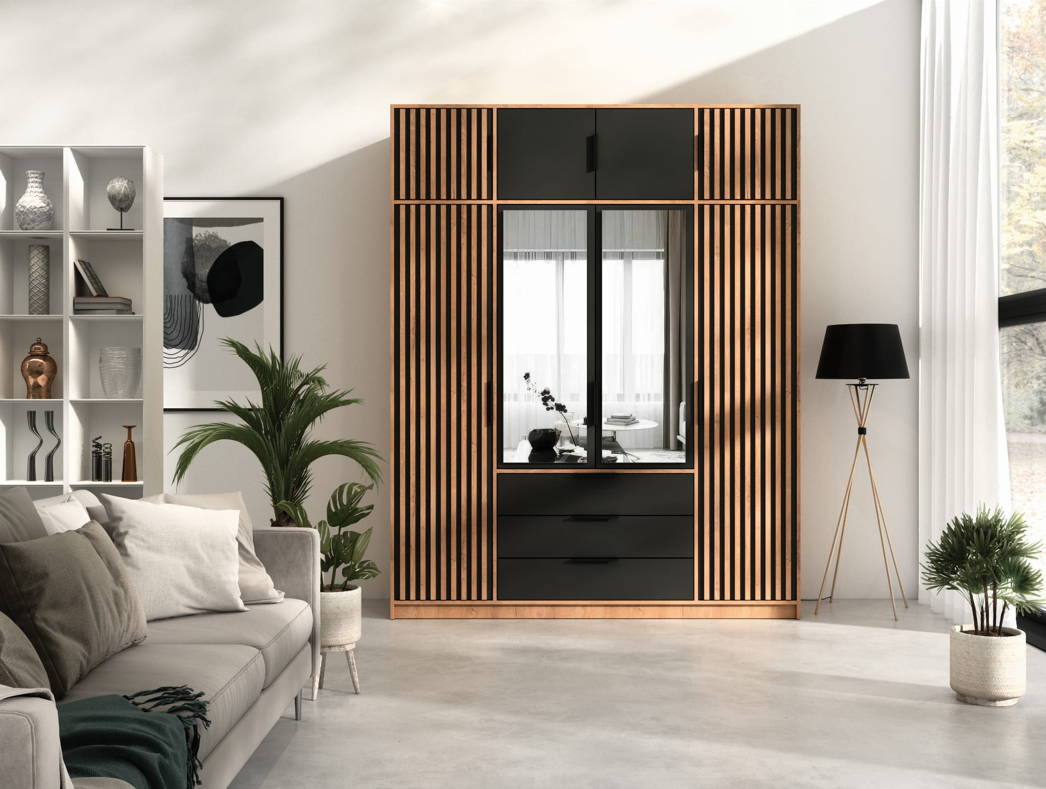 Szafa otwierana BALI LUX D4 z nadstawką dąb wotan/czarny/lustro /LAMELE