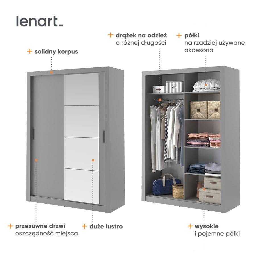 Lustro umieszczone na jednym z frontów optycznie powiększa przestrzeń. Dzięki dobrze zorganizowanemu wnętrzu szafa pomieści pokaźną ilość garderoby. Wewnątrz znajdziesz drążek na wieszaki (który możesz umieścić w prawym lub lewym pionie szafy oraz głębokie półki.