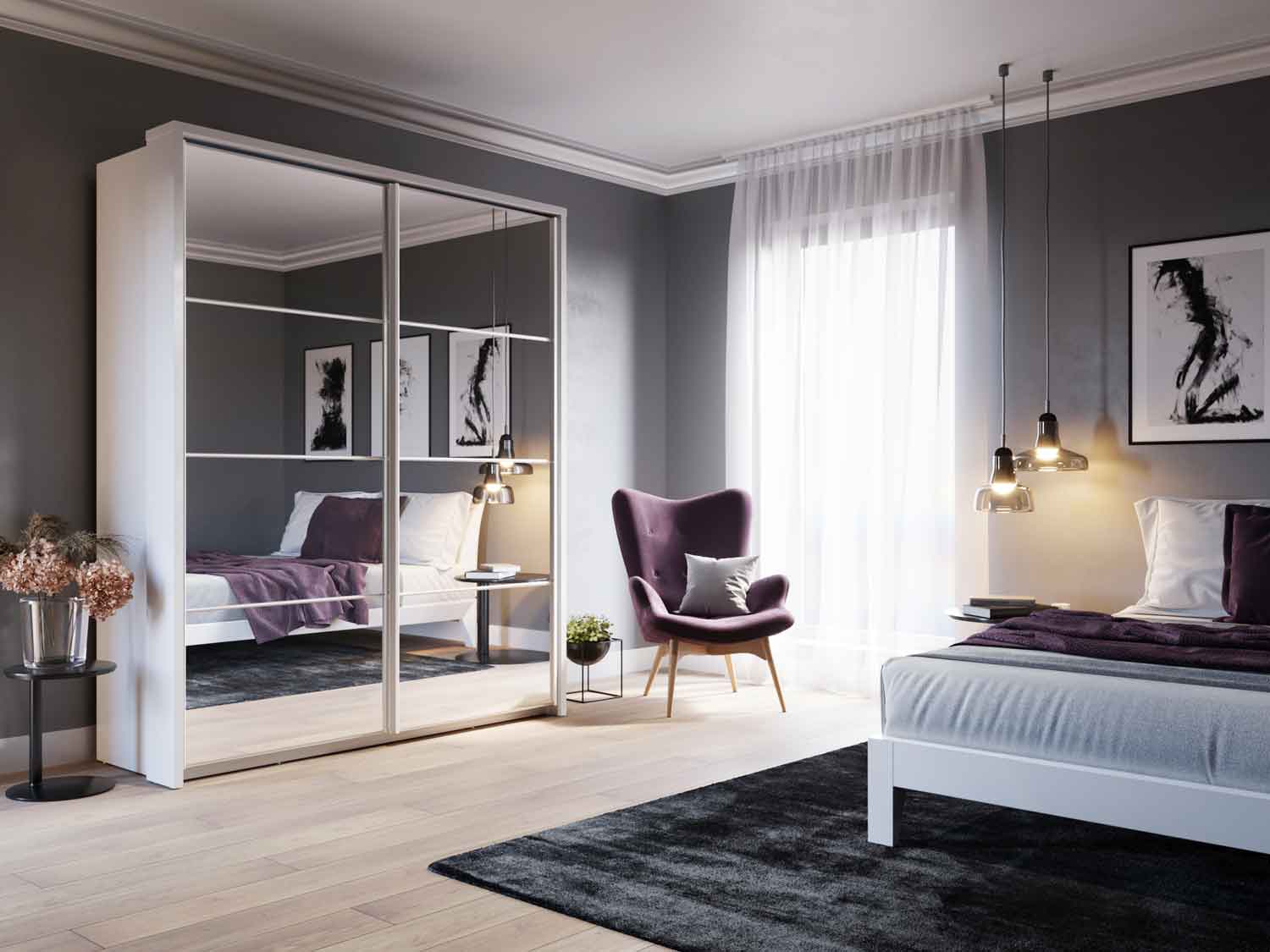 Pojemna szafa z dwojgiem drzwi przesuwnych i ergonomicznym układem funkcjonalnym. Nowoczesny, a jednocześnie uniwersalny styl szafy pozwala na dużą swobodę w aranżacji.