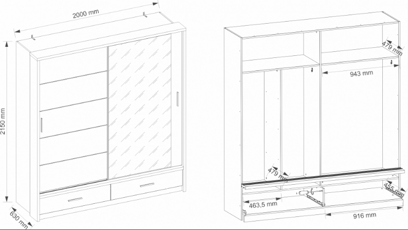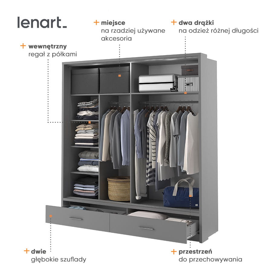 Szafę wyposażono w dwa drążki na wieszaki, regał na ubrania oraz pojemne górne półki, na których wygodnie przechowasz obuwie sezonowe, rzadziej używaną garderobę lub walizki. Na dole znajdują się dwie głębokie szuflady zewnętrzne.