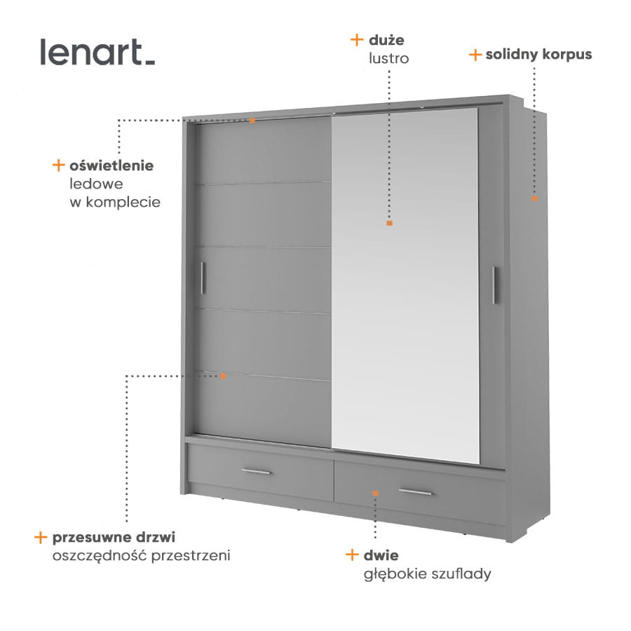 Funkcjonalna, obszerna szafa z dwojgiem drzwi przesuwnych, wyposażona w energooszczędne oświetlenie ledowe. Wysokie lustro zamontowane na jednym z frontów optycznie powiększa wnętrze, wprowadza do niego światło i pozytywnie wpływa na korzystanie z mebla. Uniwersalny styl szafy gwarantuje łatwą i udaną aranżację w różnych pomieszczeniach.