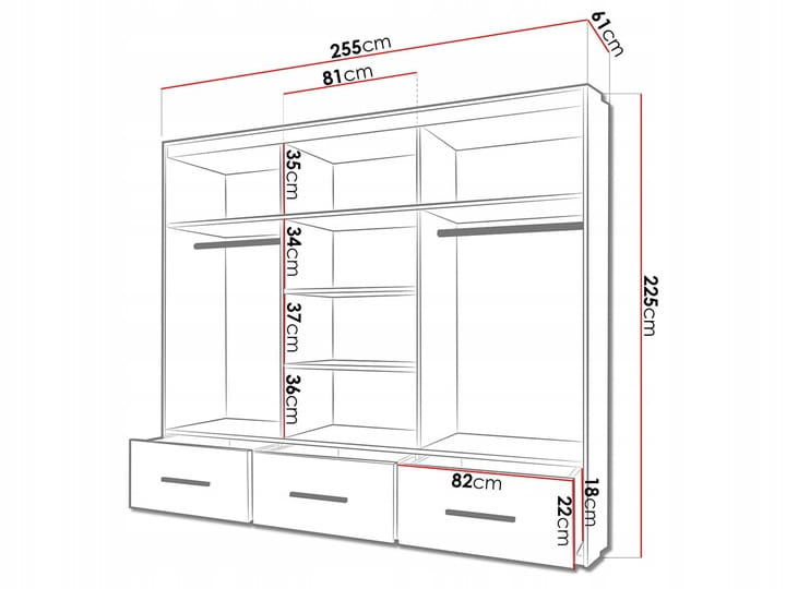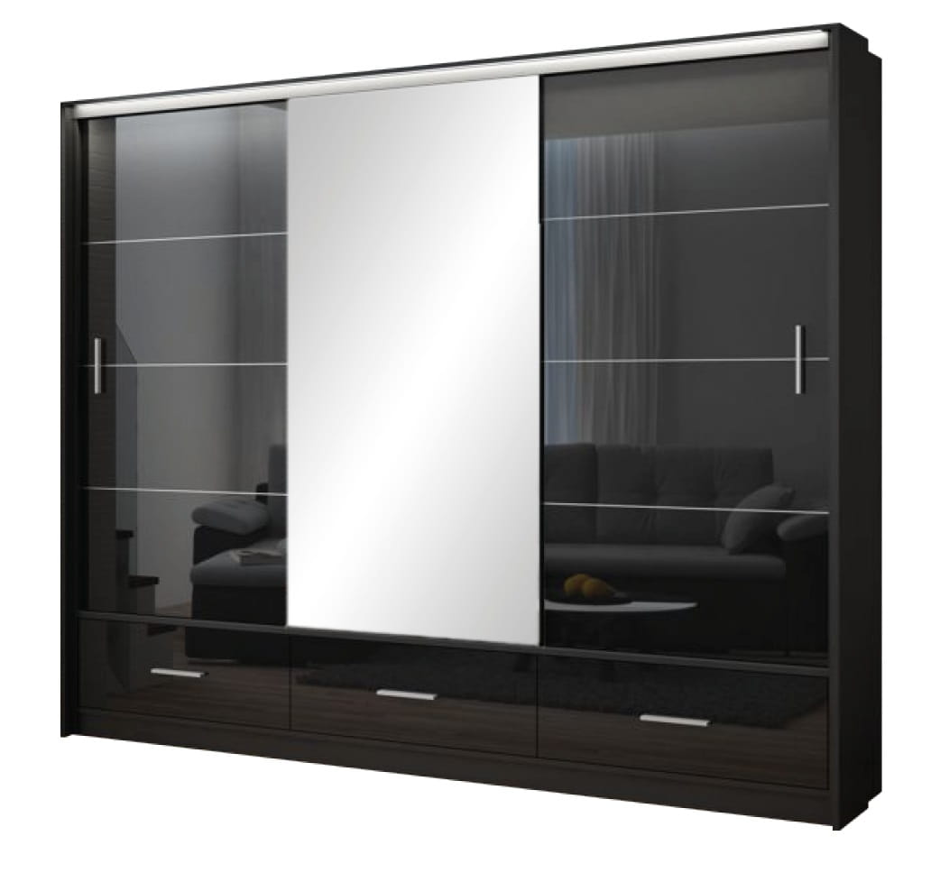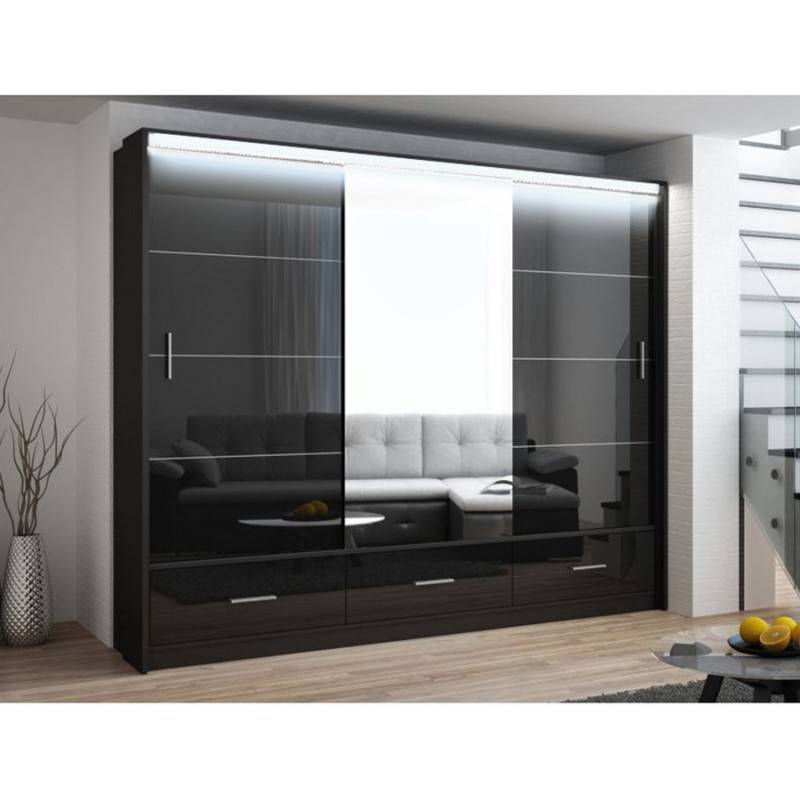 Szafa przesuwna MARSYLIA 250 z oświetleniem LED czarny/czarny połysk + lustro