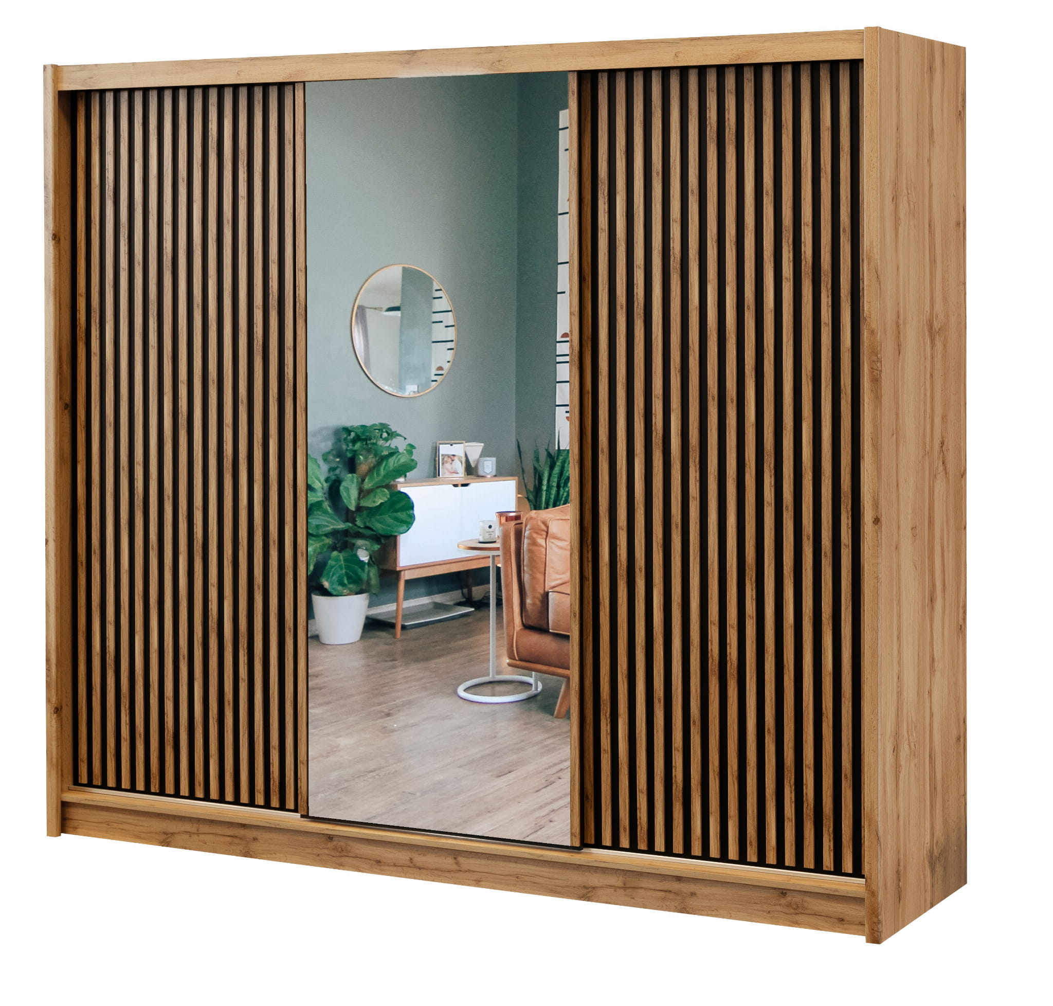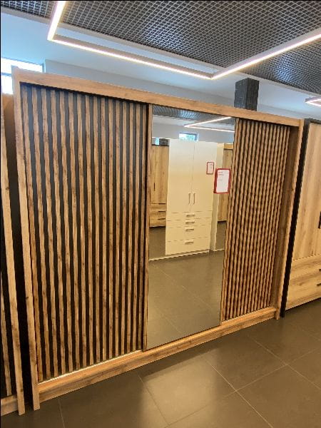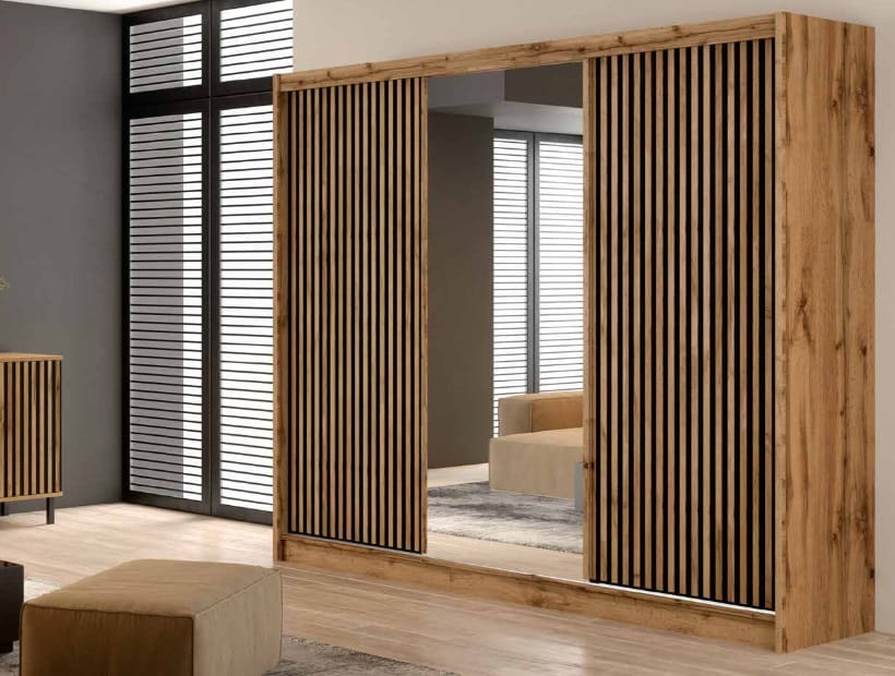 Szafa przesuwna z lamelami LONDON 250 L DĄB WOTAN/CZARNY/LUSTRO