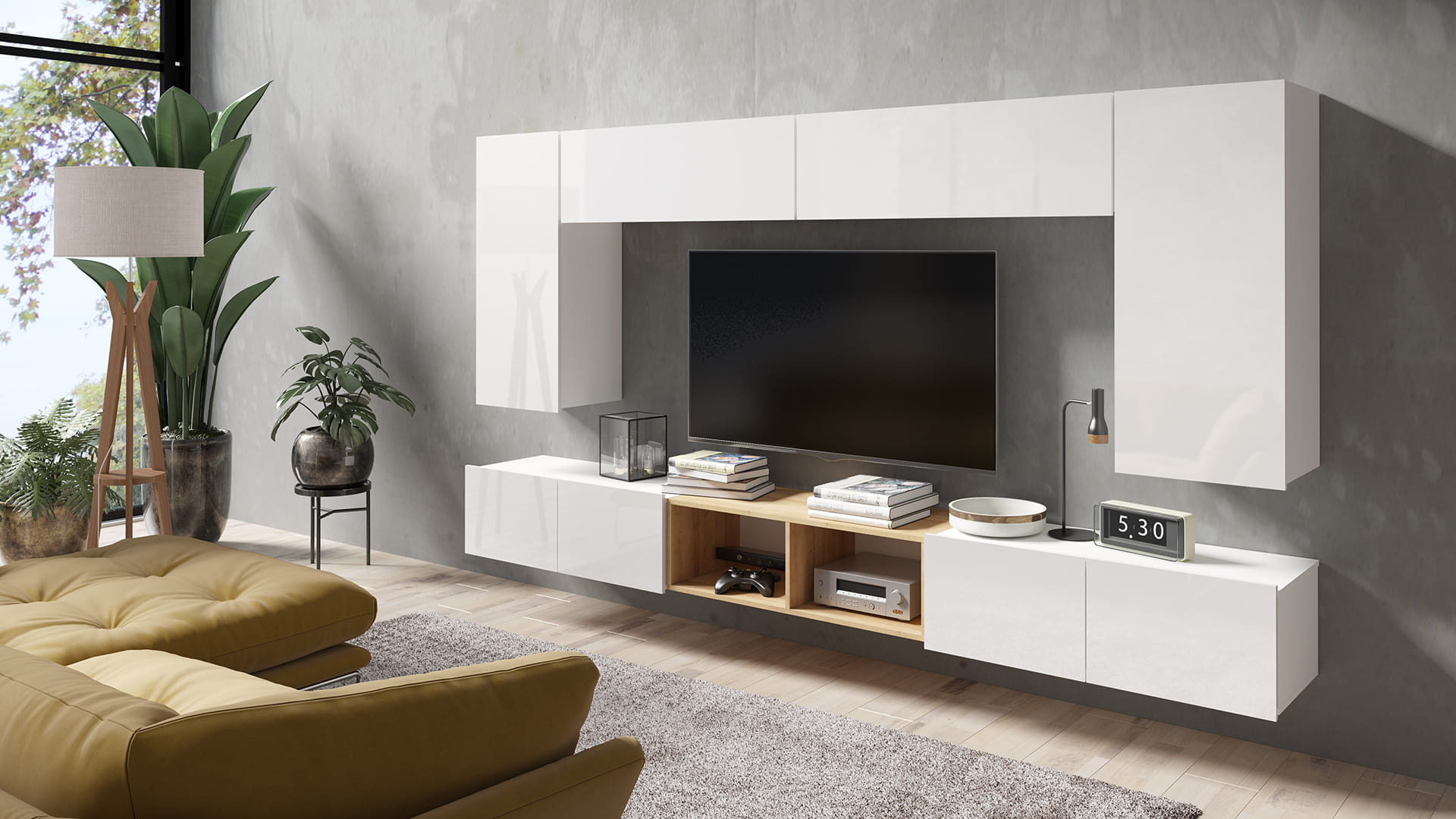 Szafki RTV, stoliki nocne oraz półka KWADRAT wykonane są uniwersalnie tzn. można je zawiesić lub postawić na podłodze po dokręceniu nóżek, które znajdują się w zestawie.