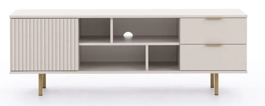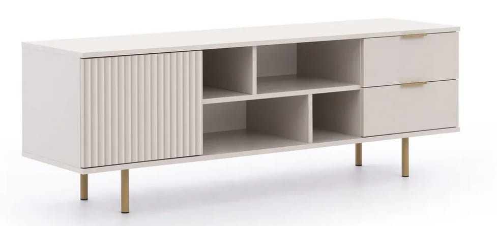 RTV NUBIA - Stylowa i funkcjonalna szafka RTV o szerokości 150 cm to doskonałe uzupełnienie nowoczesnego salonu, sypialni lub pokoju dziennego. Prosta forma połączona z lekką konstrukcją na eleganckich nóżkach nadaje meblowi wizualnej lekkości i ponadczasowego charakteru.