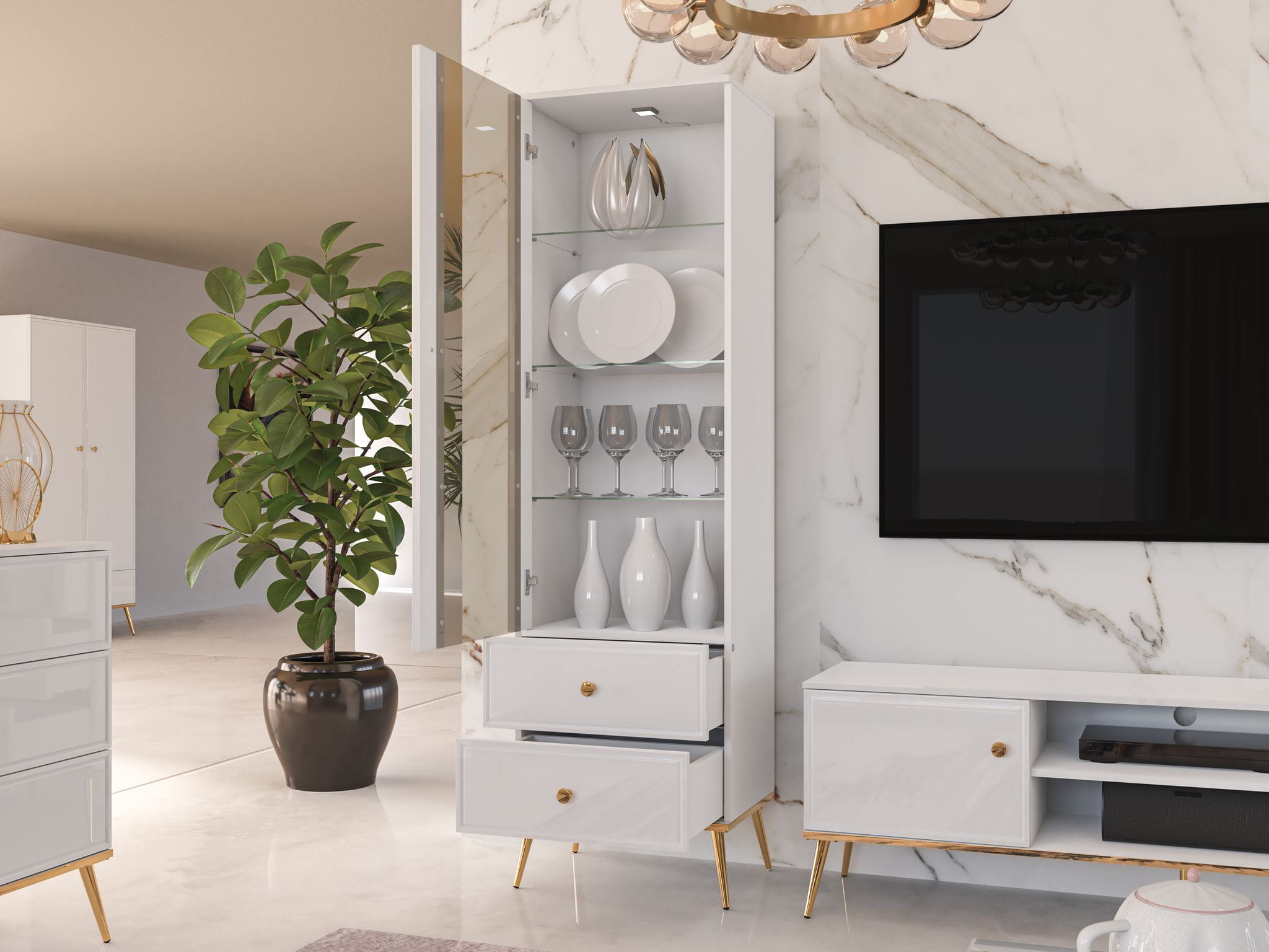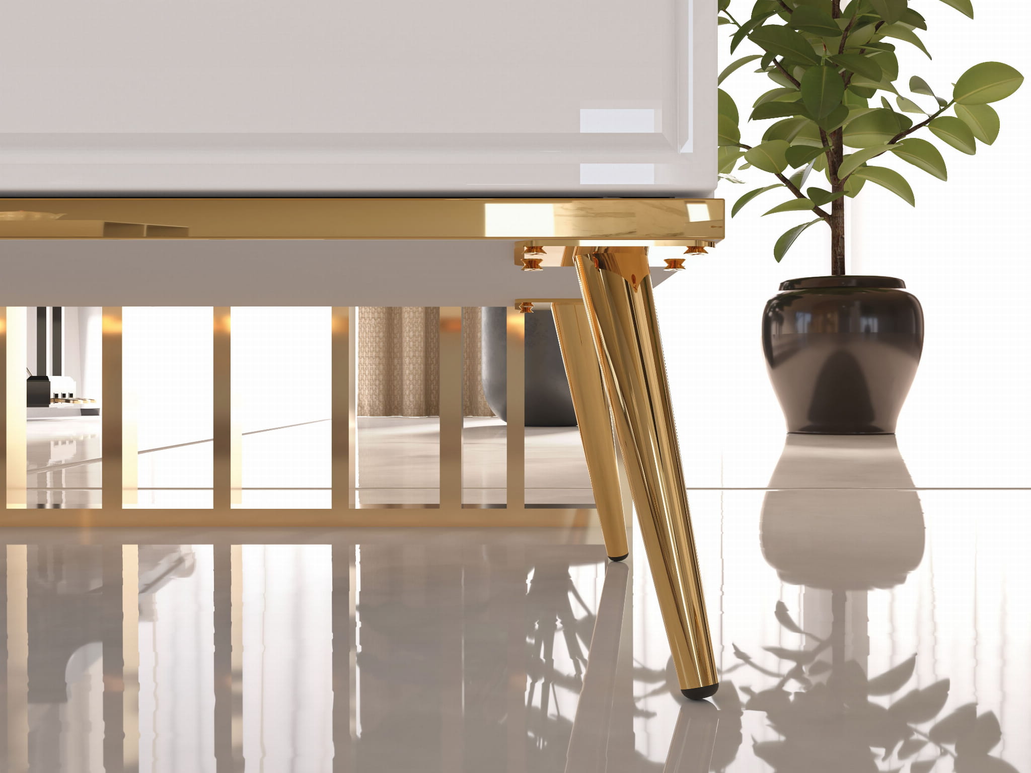 Luksusowe meble, pełne elegancji oraz połysku rozjaśnią wnętrze nowoczesnego salonu jak i sypialni. Skośne stożkowe nóżki w kolorze błyszczącego złota, idealnie komponują się z wieńcem dolnym wykończonym w tym samym odcieniu złota. Delikatne zdobienia na drzwiczkach oraz złote uchwyty stanowią dopełnienie tej pełnej kunsztu oraz szyku kolekcji.