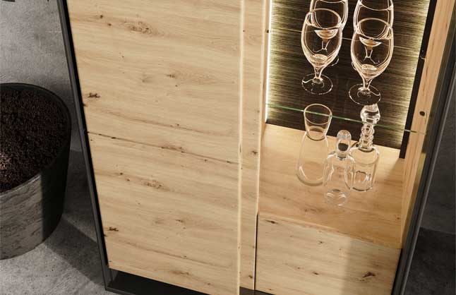 Nowoczesny design został podkreślony przez ciekawy dekor oraz czarną, smukłą podporę. Ledowe oświetlenie (dostępne w komplecie) akcentuje urodę mebla, a wieczorem wprowadza do wnętrza nastrojowy klimat.