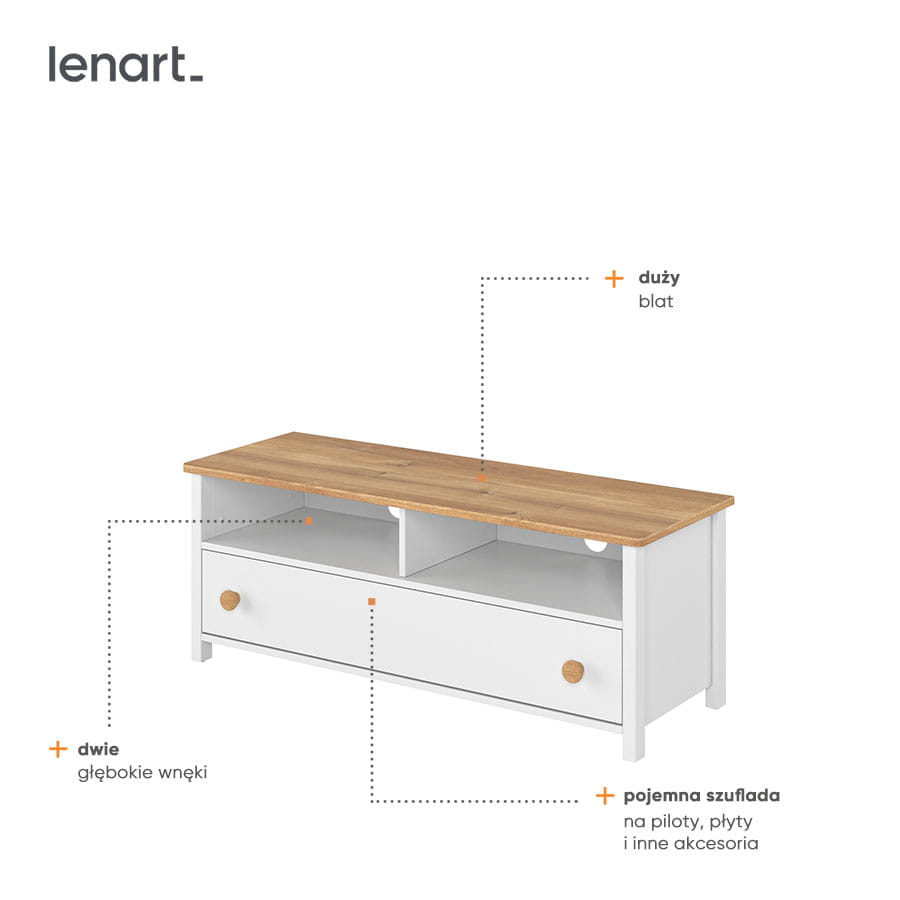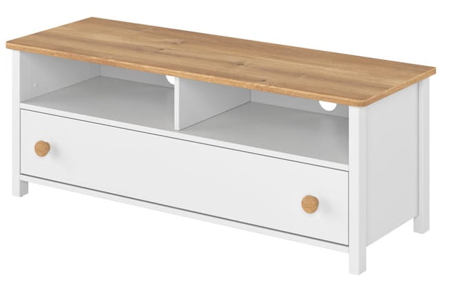 Funkcjonalna szafka RTV z dwiema uniwersalnymi wnękami na sprzęty elektroniczne i pojemną, głęboką szufladą.