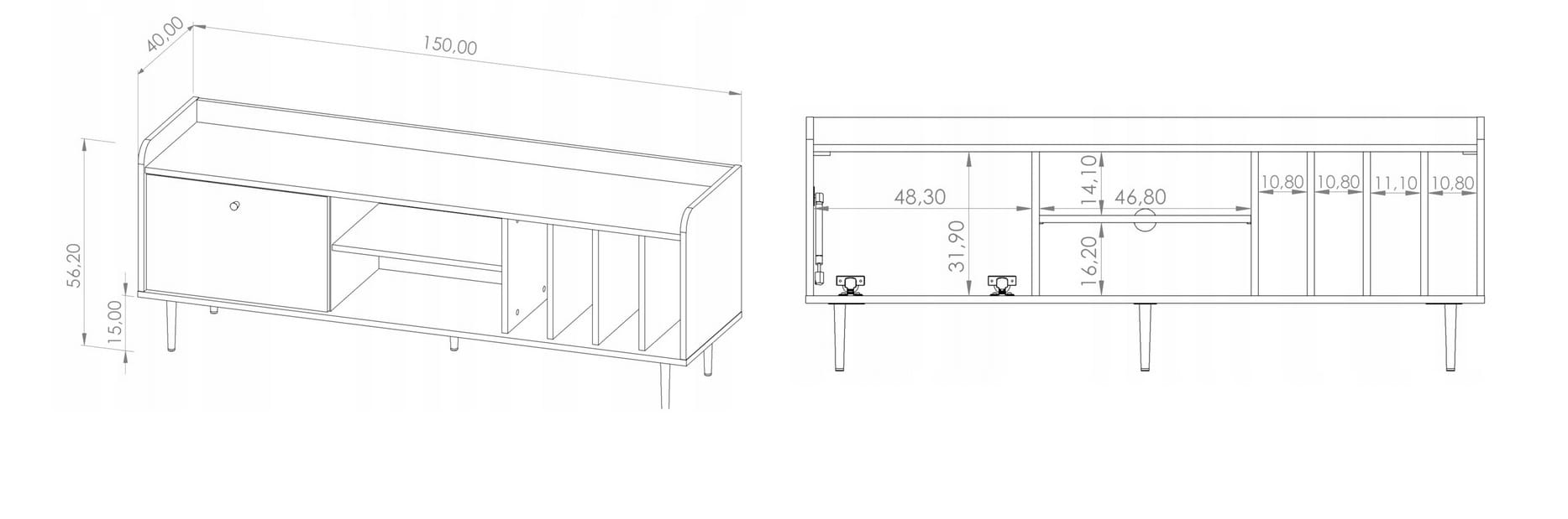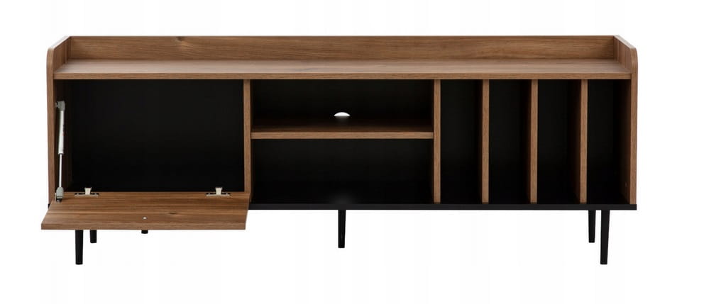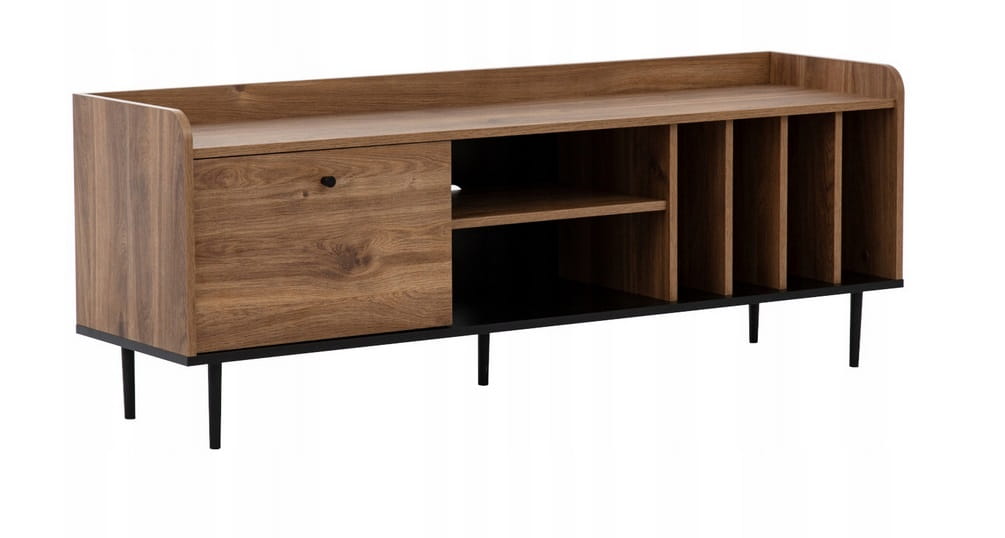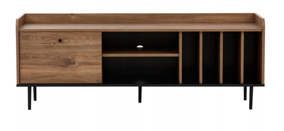 Szafka RTV VASINA 150 na nóżkach 15 cm to nowoczesny i funkcjonalny mebel idealny do salonu. Dzięki podwyższonym nóżkom zapewnia lekkość konstrukcji oraz ułatwia utrzymanie porządku pod meblem. Oferuje praktyczną przestrzeń do przechowywania sprzętu elektronicznego, płyt czy akcesoriów, a jej minimalistyczny design doskonale wpisuje się w różne style wnętrz.