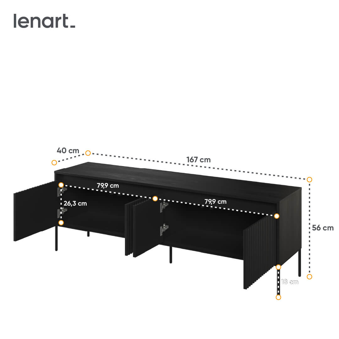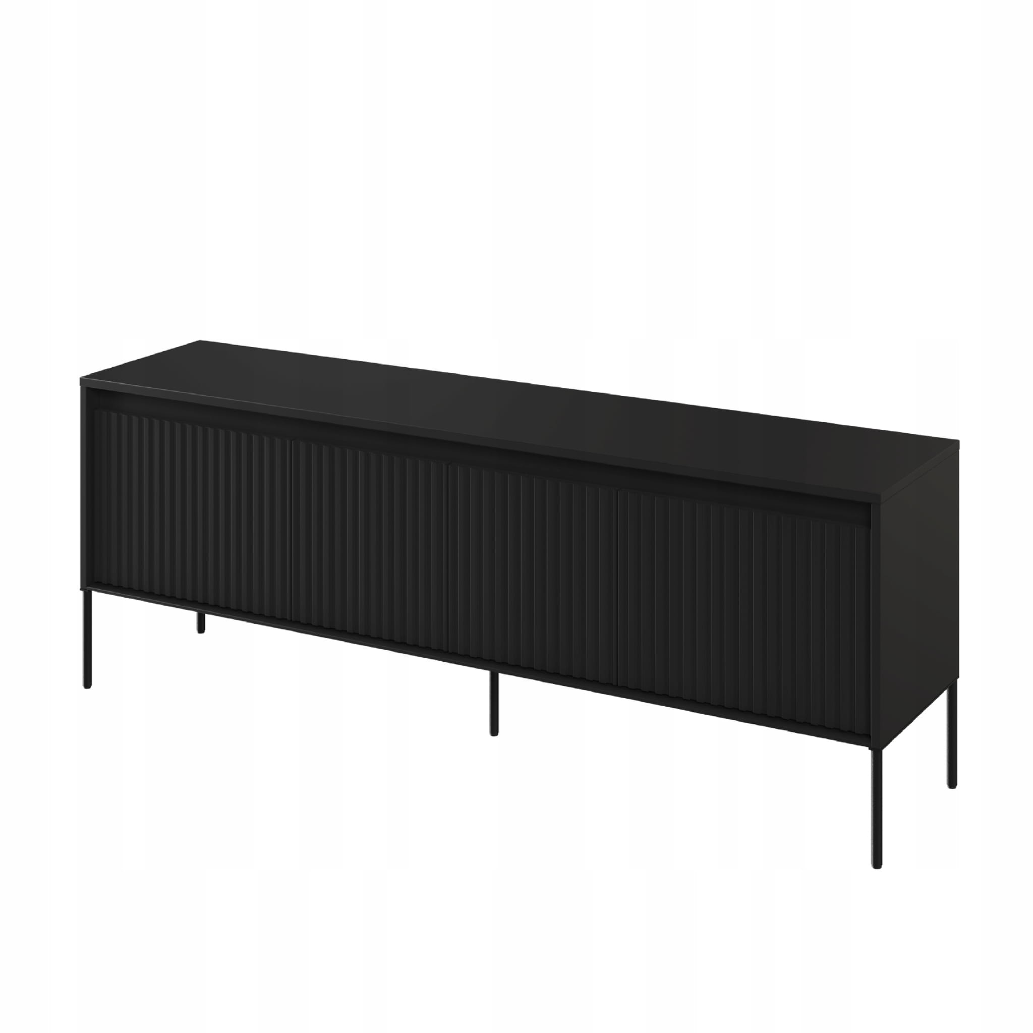 Dodatkowym atutem naszej czarnej szafki RTV jest jej ryflowany front. Ten designerski detal nadaje meblowi unikalnego charakteru i subtelnie go wyróżnia, podkreślając jednocześnie jego elegancję. Czarna szafka RTV nada Twojemu salonowi nowoczesności, stylu i elegancji, a dzięki subtelnemu oświetleniu ledowemu wprowadzi do wnętrza nastrojowy klimat.