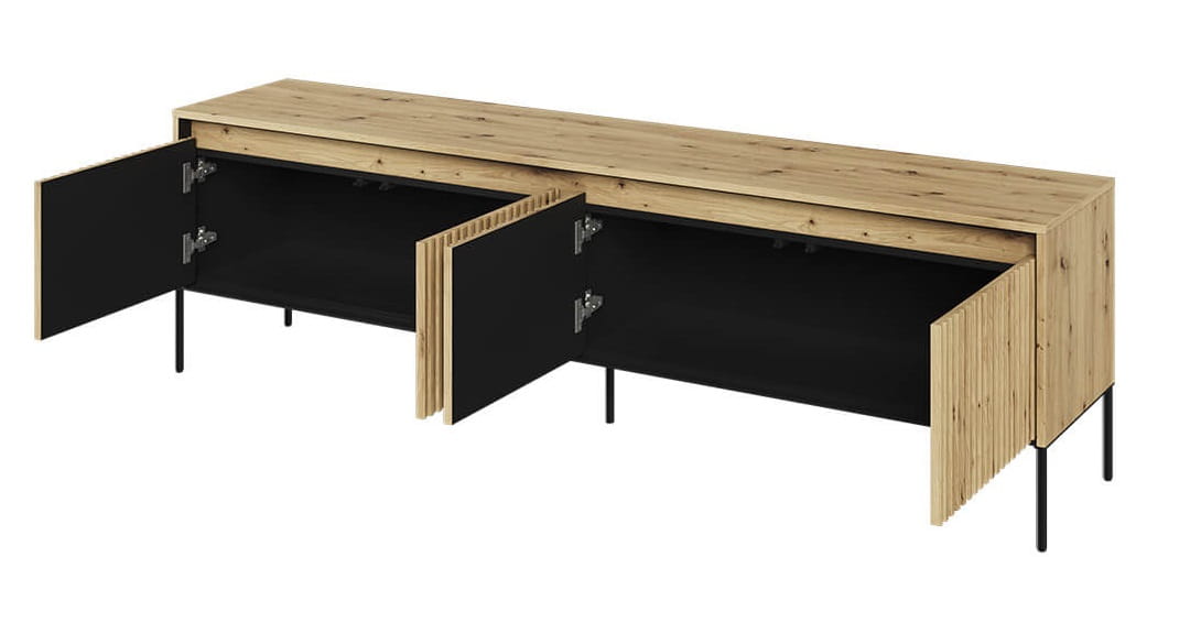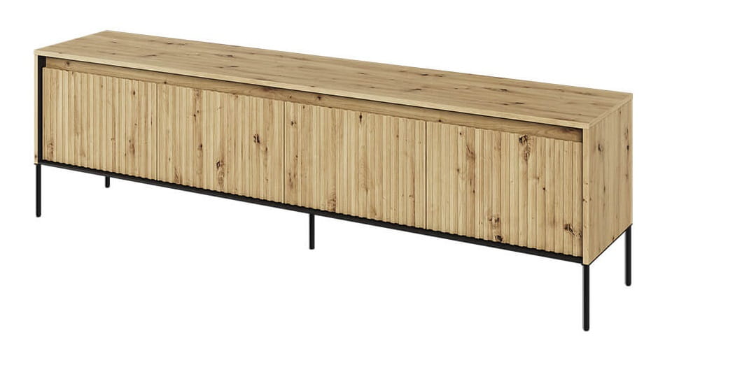 Komoda RTV na nóżkach to synonim elegancji i stylu. Jej unikalne ryflowane fronty nadają meblowi wyjątkowego charakteru. To niezwykłe połączenie nowoczesnego designu z tradycyjnymi elementami sprawia, że ciężko oderwać od niej wzrok. Jednym z wyróżniających elementów naszej komody RTV jest jej kolor dąb artisan. Dzięki niemu komoda wpasuje się doskonale w różne style wnętrz, dodając im przytulności i elegancji. Dodatkowo, komoda jest podświetlana, co nadaje trójwymiarowego efektu i tworzy przyjemną atmosferę.