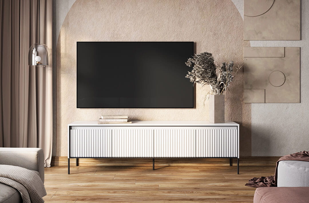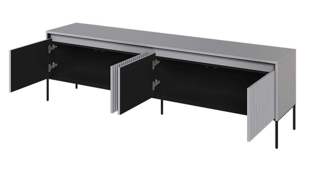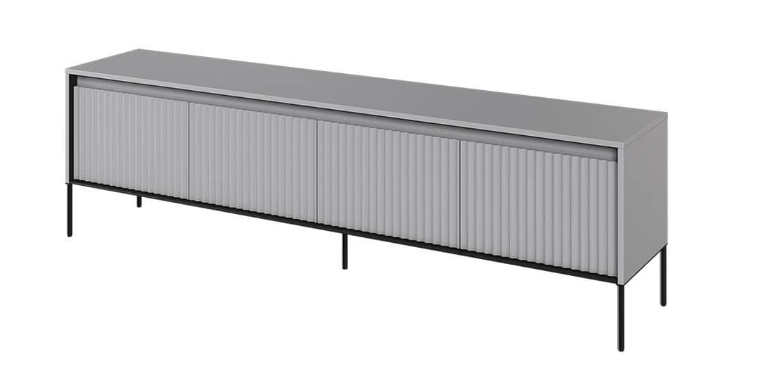 Pragniesz stworzyć w swoim salonie stylowe i funkcjonalne miejsce do przechowywania sprzętu multimedialnego? Nasza RTV szafka spełni Twoje oczekiwania, łącząc w sobie elegancję, solidność wykonania i praktyczność! Nasza RTV szafka w kolorze szarym to idealne rozwiązanie dla Twojego salonu. Jej nowoczesny design i ryflowane fronty nadają meblowi unikalny wygląd, który przyciąga uwagę i wzbogaca estetykę pomieszczenia.