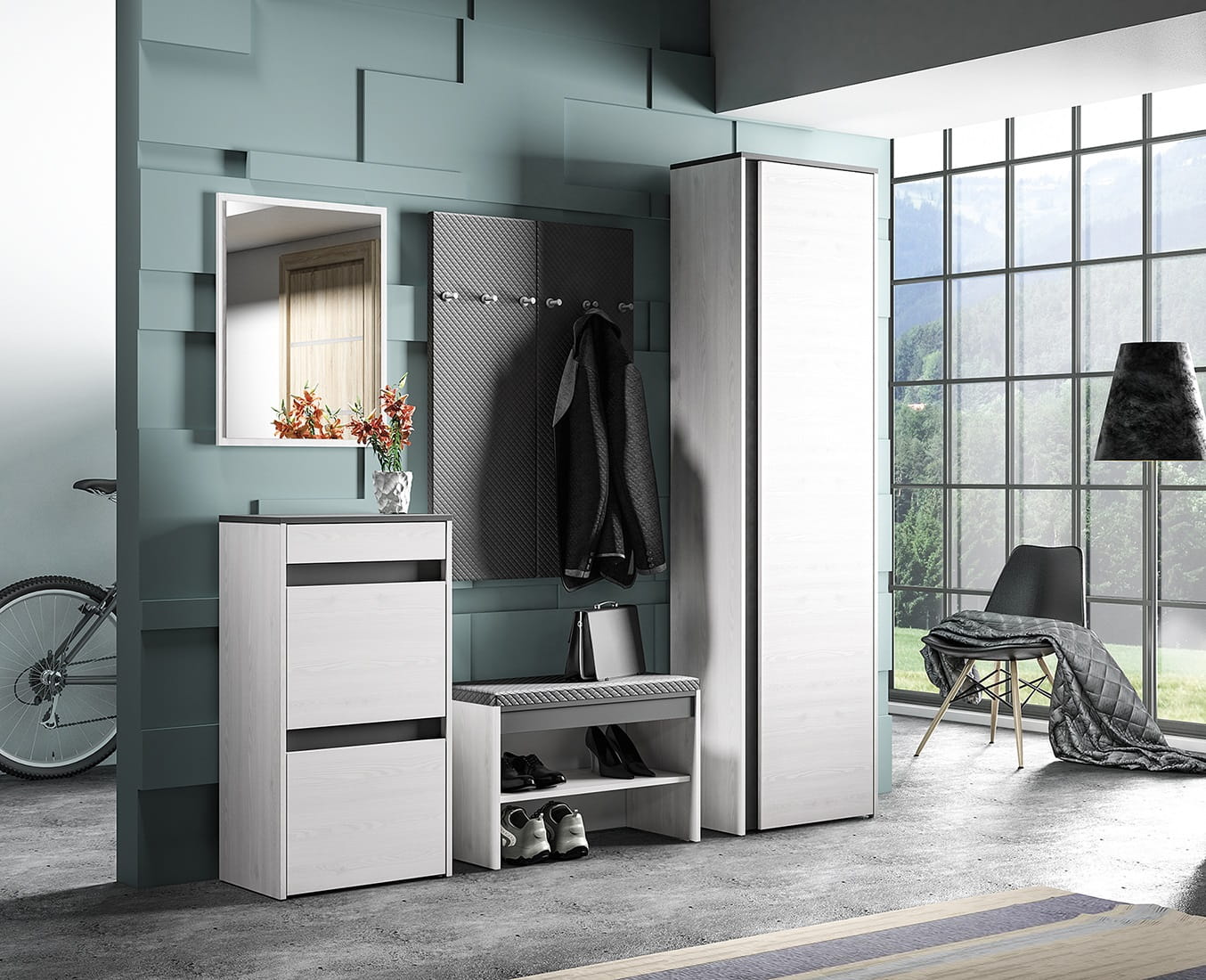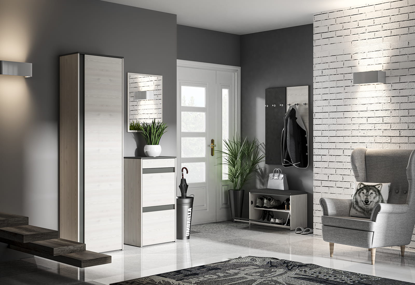 Hyga to nowoczesna kolekcja mebli do przedpokoju. Dzięki doborowi odpowiednich brył idealnie sprawdzi się zarówno w małym jak i dużym wnętrzu. Kontrastujące połączenie dekorów - sosny śnieżnej i antracytu - podkreśla charakter mebli i dodaje im lekkości. Szare, pikowane obicie wieszaka i siedziska dodaje meblom ponadczasowej elegancji oraz zapewnia wysoki komfort użytkowania.