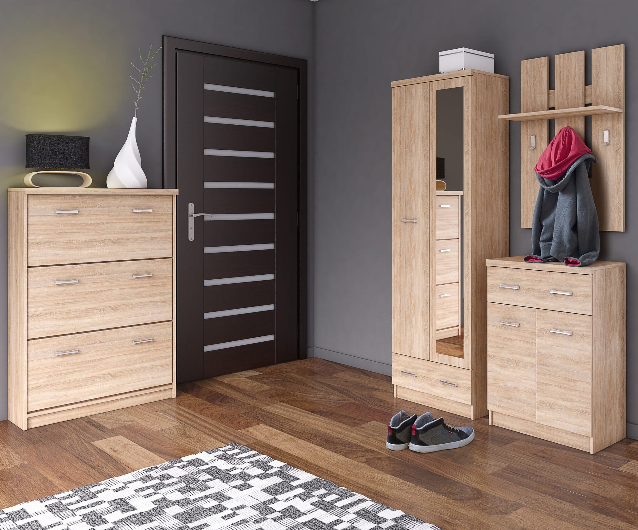 Przedpokój to miejsce przeznaczone przede wszystkim na pozostawienie swojego okrycia wierzchniego po wejściu do domu lub mieszkania. Dlatego też z myślą o wygodzie naszych klientów stworzyliśmy specjalny wieszak przeznaczony do tego celu. Dostępna jest w dwóch wersjach kolorystycznych – białym oraz dąb sonoma. Razem z szafką na buty również pochodzącej z kolekcji TOP MIX stworzy idealnie funkcjonalną całość.
